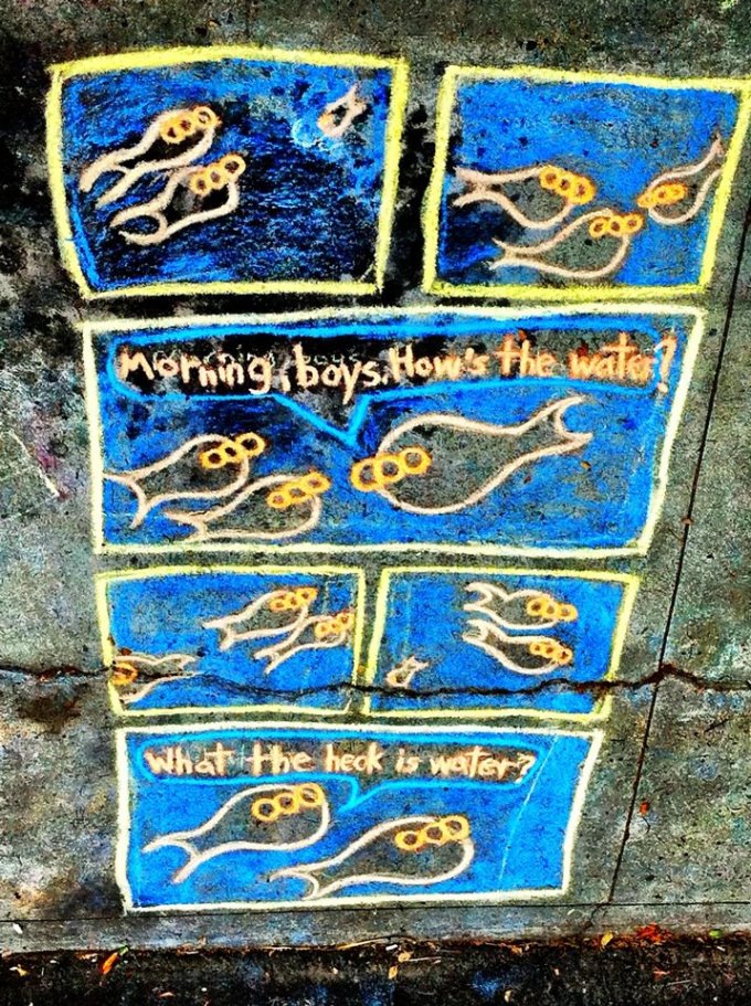 “There are these two young fish swimming along, and they happen to meet an older fish swimming the other way, who nods at them and says, ‘Morning, boys, how’s the water?’ And the two young fish swim on for a bit, and then eventually one of them looks over at the other and goes, ‘What the hell is water?'”