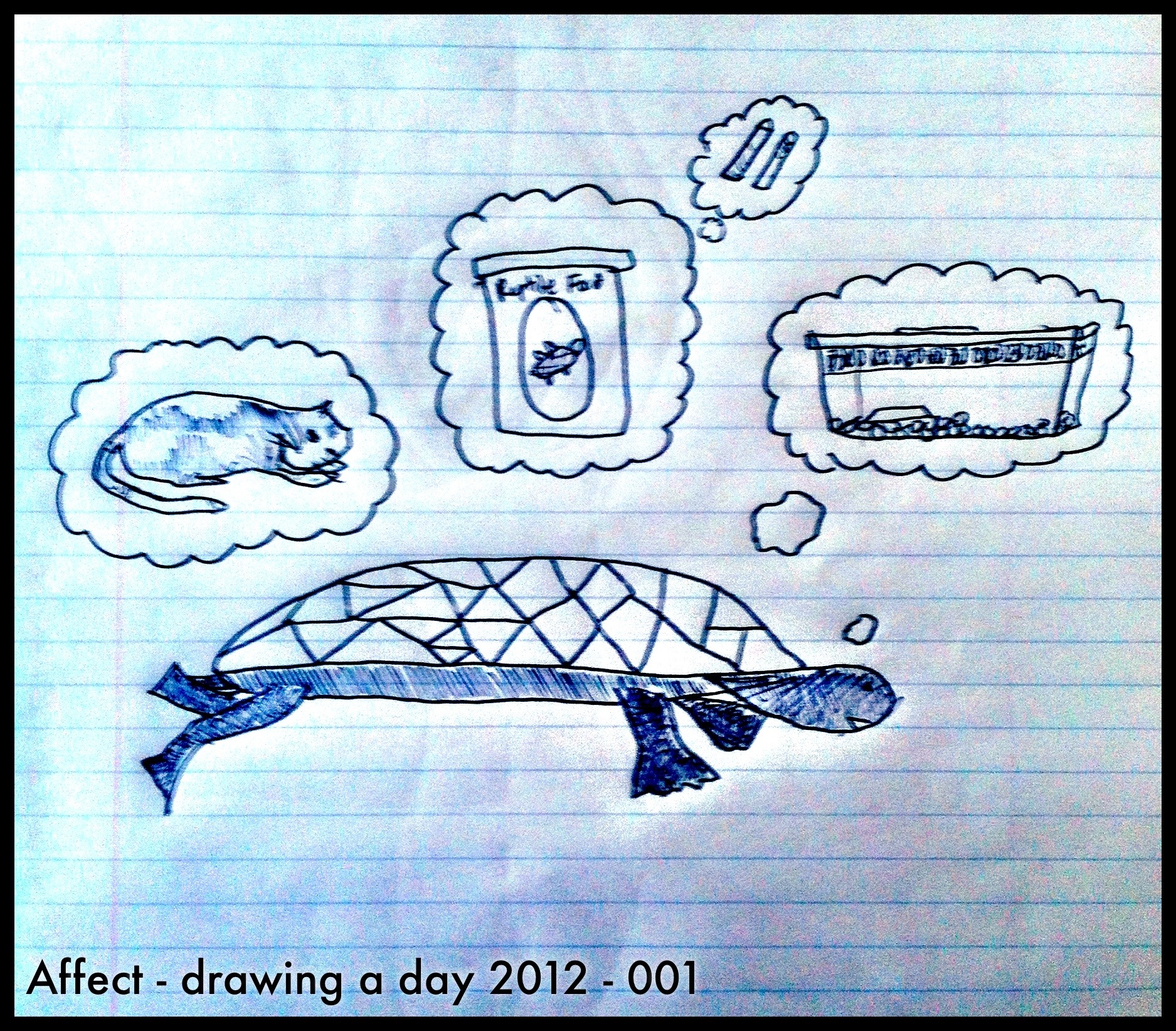 [My] turtle’s thoughts 1* by LornaPhone May 1, 2012December 27, 2012 *I’m going to make a second version that anthropomorphizes my turtle and/or gives it some more complicated and interesting thoughts. Share th[i]s:TweetMoreShare on Tumblr Click to email a link to a friend (Opens in new window) Email Click to share on Reddit (Opens in new window) Reddit Like Loading... Related