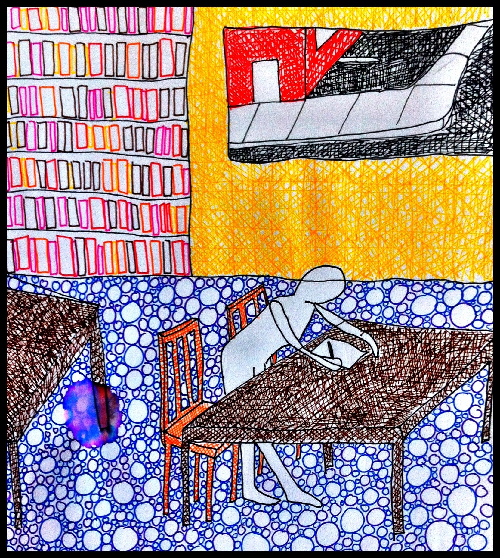 I enjoyed your drawing. It reminded me of a nice day in a big library. I like the fact you put a pen, and not a smartphone, in the hand. Very nice.