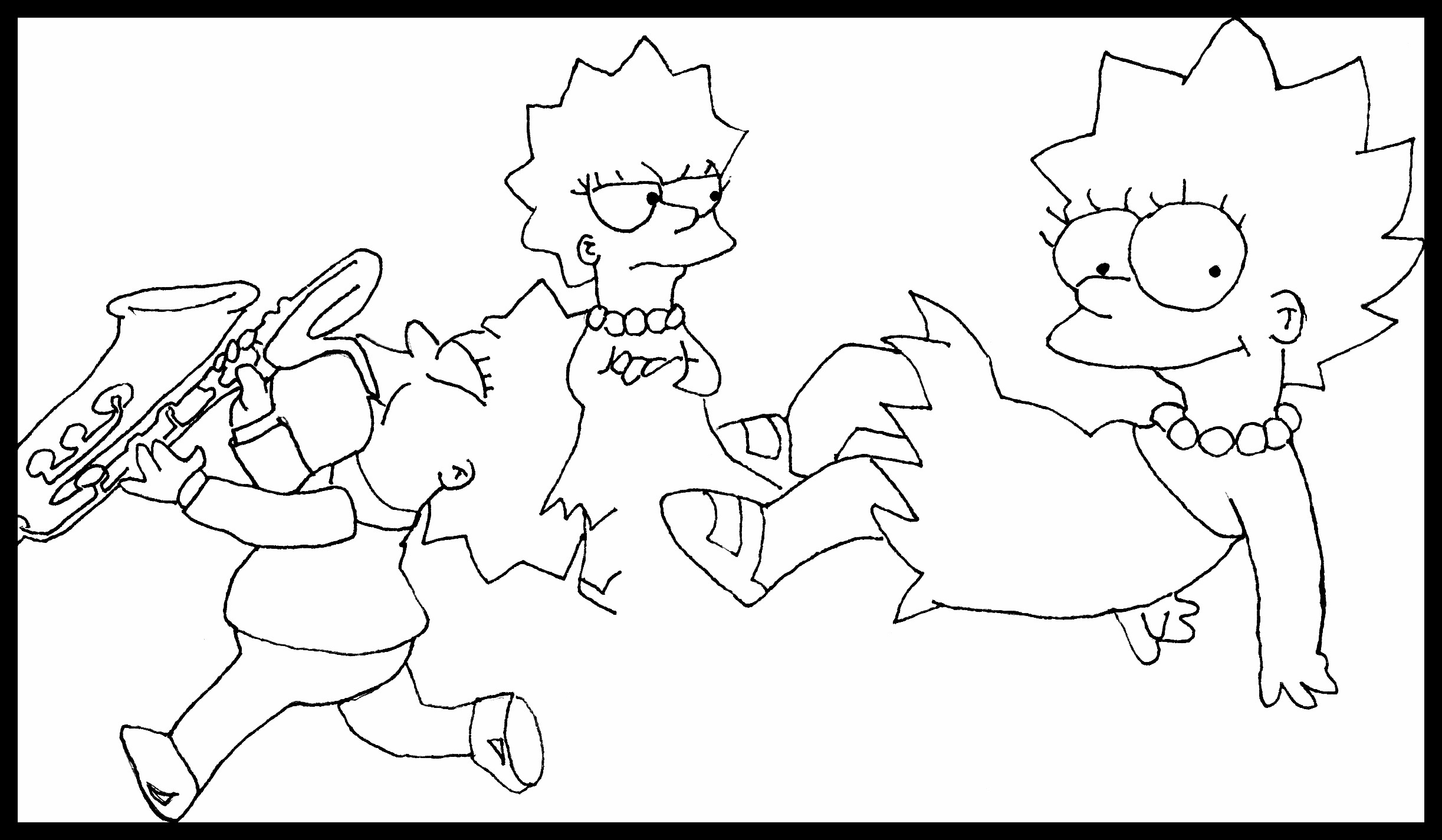 30 day drawing challenge, day 7: favorite cartoon character. I started with the Lisa in the center, but realized that she looked really annoyed (in the image I based this center drawing on, Bart is next to her revealing his butt to a crowd). I like Lisa because she’s smart, vegetarian, into music, and a little sister (like me). The multiple versions of the drawing reveal my process and serve as potential coloring book material. What if Lisa wasn’t yellow? The power is in your hands…