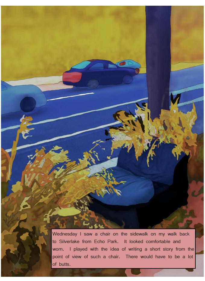 Wednesday I saw a chair on the sidewalk on my walk back to Silverlake from Echo Park. It looked comfortable and worn. I played with the idea of writing a short story from the point of view of such a chair. There would have to be a lot of butts.