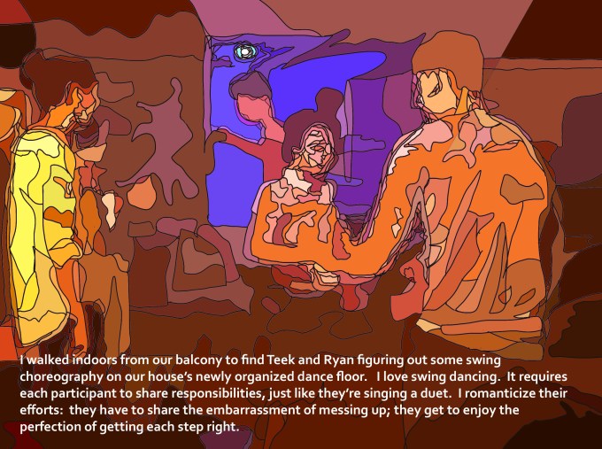 I walked indoors from our balcony to find Teek and Ryan figuring out some swing choreography on our house’s newly organized dance floor. I love swing dancing. It requires each participant to share responsibilities, just like they’re singing a duet. I romanticize their efforts: they have to share the embarrassment of messing up; they get to enjoy the perfection of getting each step right.