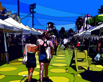 Couples in their workout outfits (perhaps they have just biked 10 miles) peruse the produce tables, discussing eggplant and lettuce.