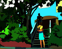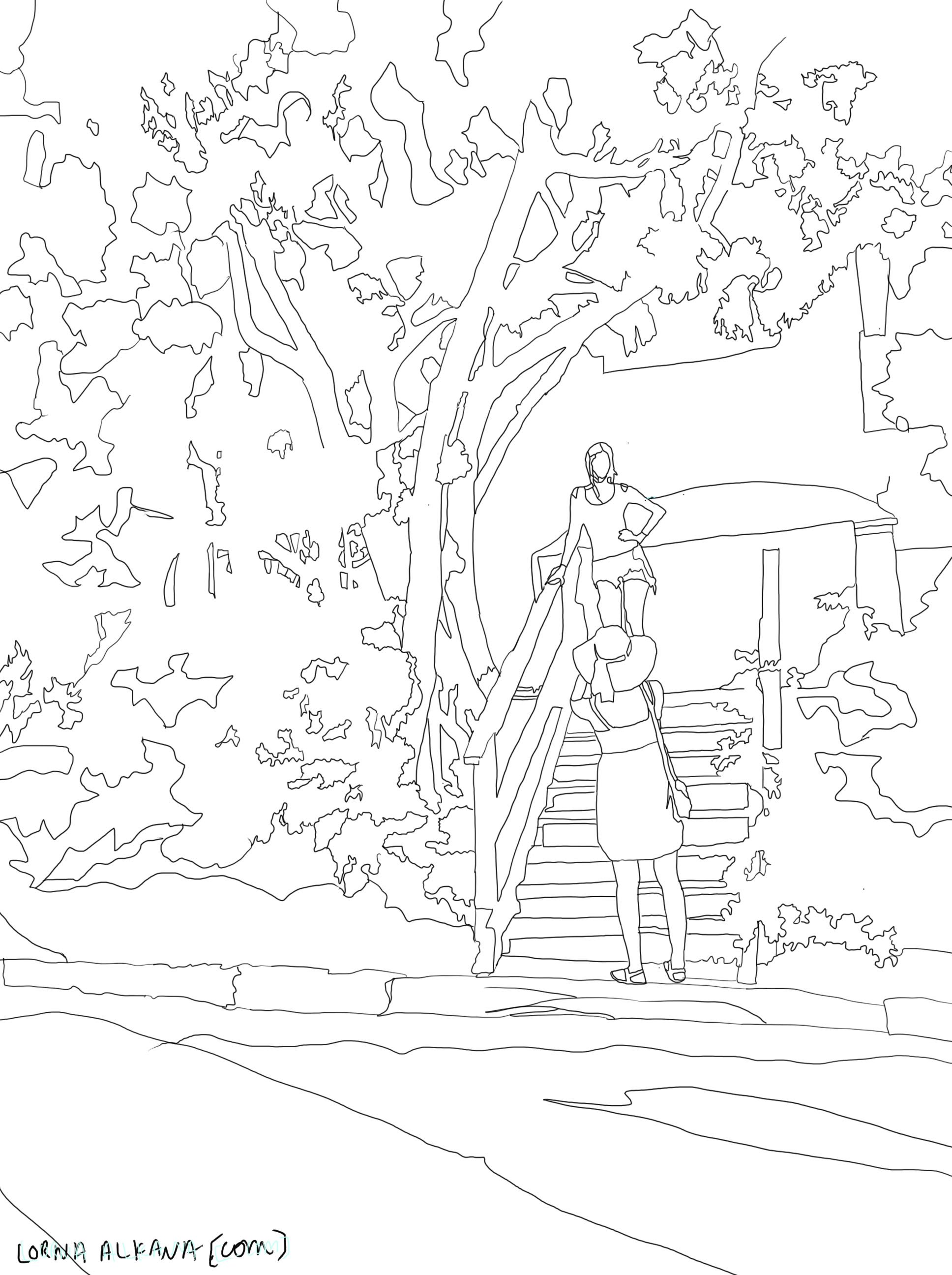 The line drawing for this image is missing a lot of the lines that I needed to add once I found more shapes and shades in the trees. Also, in the text, I mention never-ending stairs, but drew a very small set of stairs. These steps are a bridge between the two sides of Descanso (each side is one way). This is right by the Music Box Stairs that Laurel and Hardy maneuvered a piano up and down.