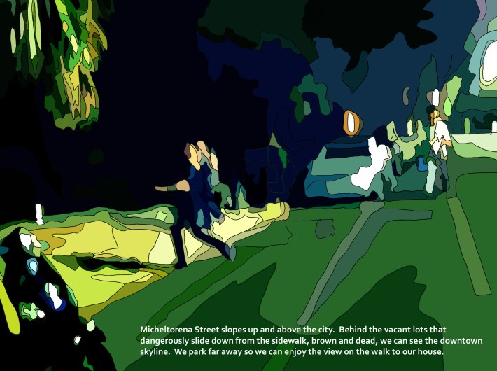 Micheltorena Street slopes up and above the city. Behind the vacant lots that dangerously slide down from the sidewalk, brown and dead, we can see the downtown skyline. We park far away so we can enjoy the view on the walk to our house.