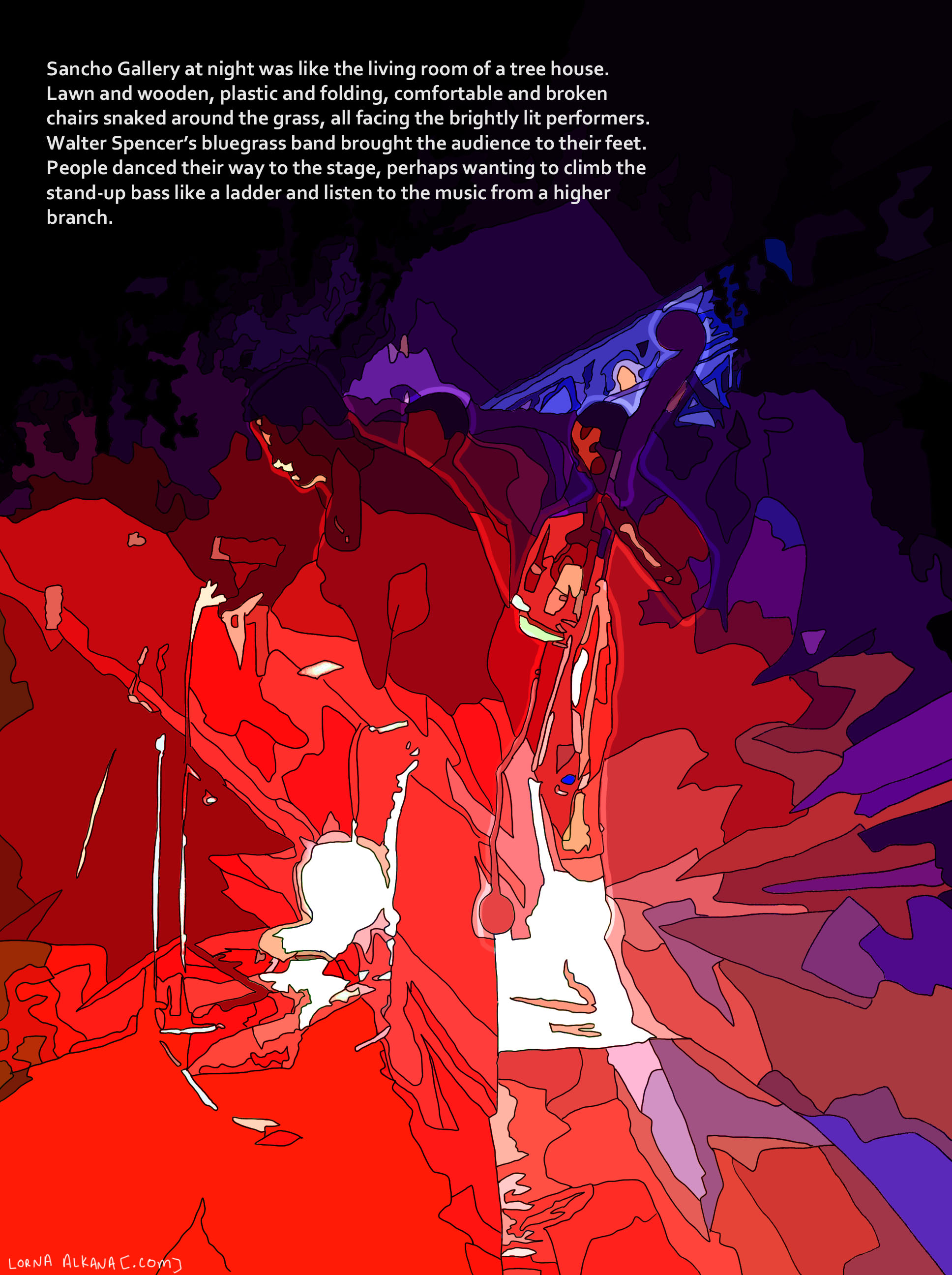 Sancho Gallery at night was like the living room of a tree house. Lawn and wooden, plastic and folding, comfortable and broken chairs snaked around the grass, all facing the brightly lit performers. Walter Spencer’s bluegrass band brought the audience to their feet. People danced their way to the stage, perhaps wanting to climb the stand-up bass like a ladder and listen to the music from a higher branch…