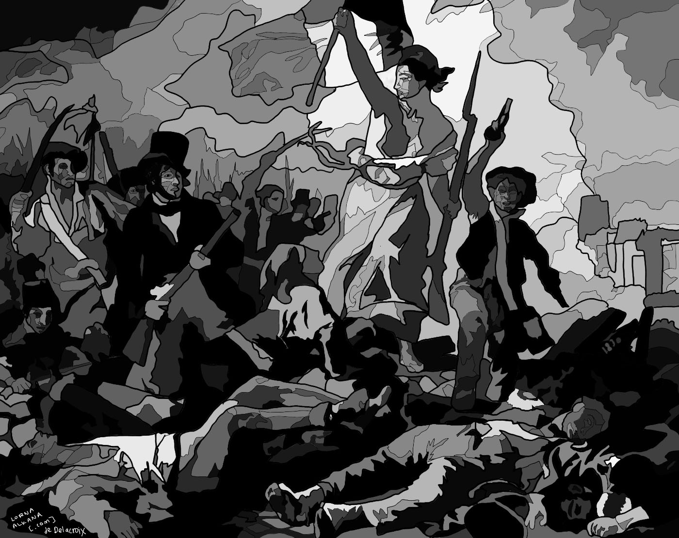 I’m working with my mom on a graphic/comic biography of the French revolutionary Suzanne Volkan. My mom wants to incorporate images from the time into the comic. I finished a first round of my interpretation of the Delacroix painting “Liberty Leading the People”. Man, I didn’t realize how many dead people were in the painting.