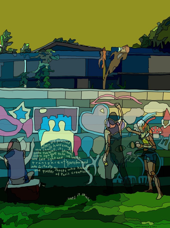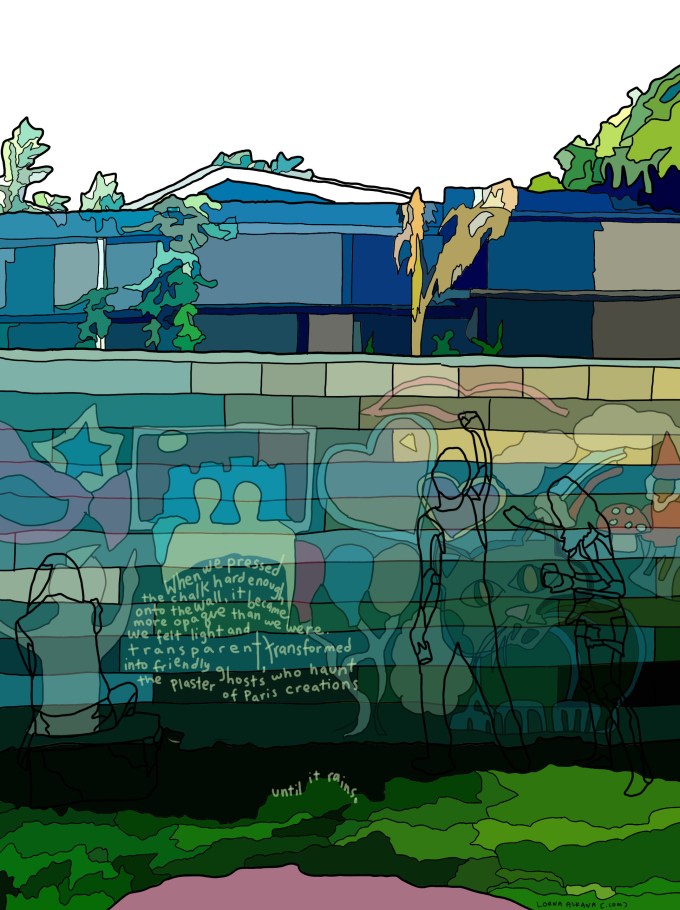 When we pressed the chalk hard enough onto the wall, it became more opaque than we were. We felt light and transparent, transformed into friendly ghosts who haunt the Plaster of Paris creations until it rains.