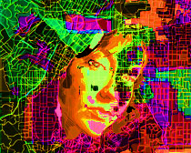 This is the final 20″x30″ digital drawing. I wanted to integrate the face into the map, but the portrait may be too obvious here. I played around with brightness/contrast and hue/saturation in order to add some depth and enhance the colors. I also varied the lines’ opacity and color.
