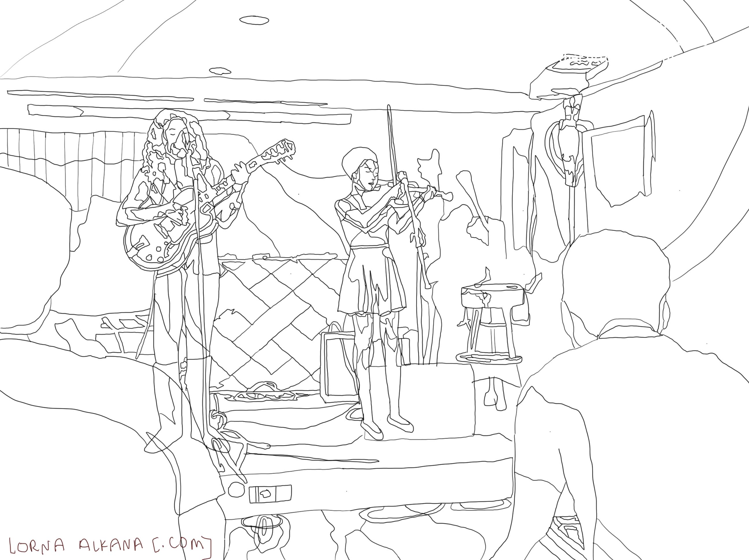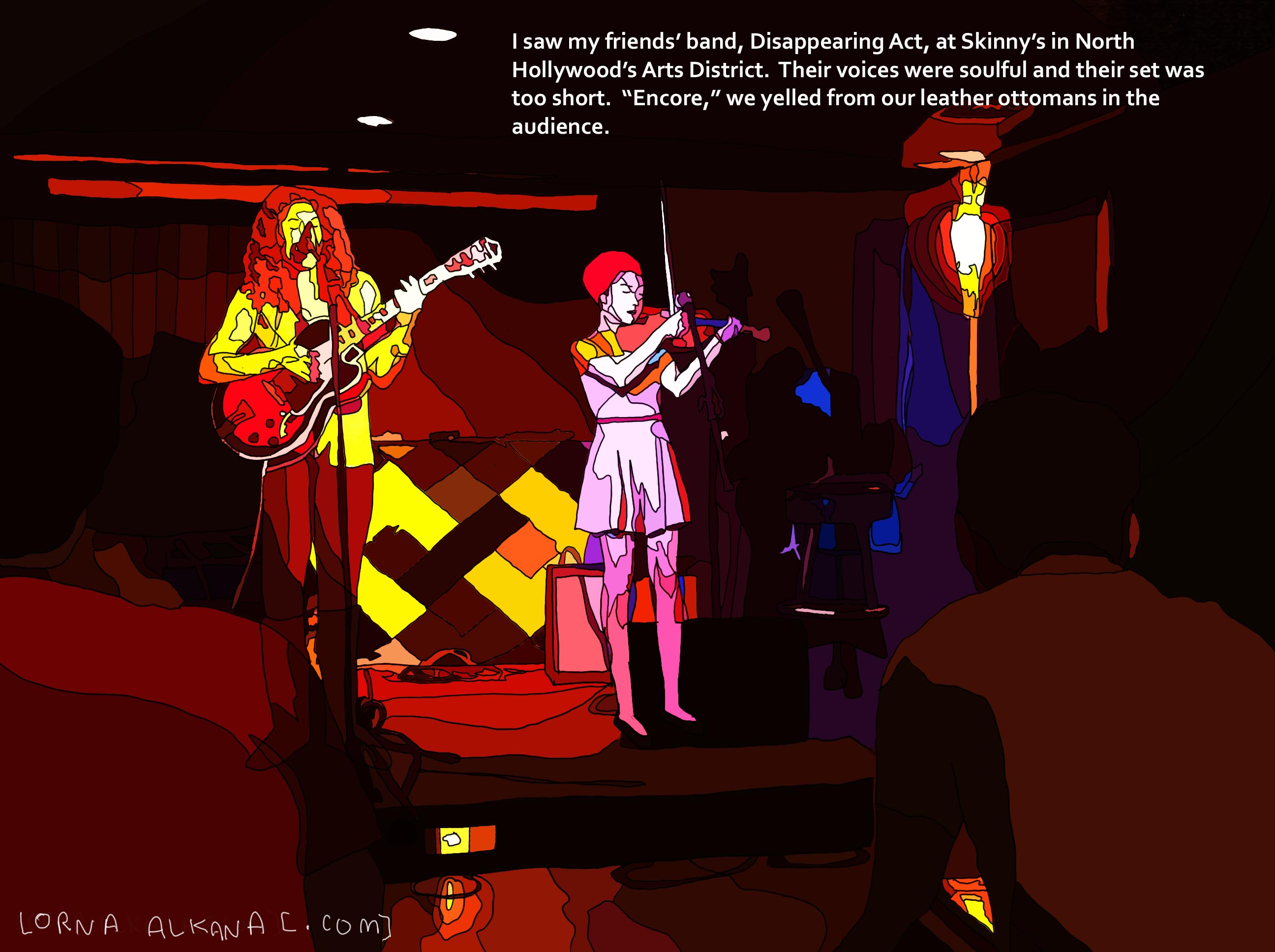 Image Text: I saw my friends’ band, Disappearing Act, at Skinny’s in North Hollywood’s Arts District. Their voices were soulful and their set was too short. “Encore,” we yelled from our leather ottomans in the audience.