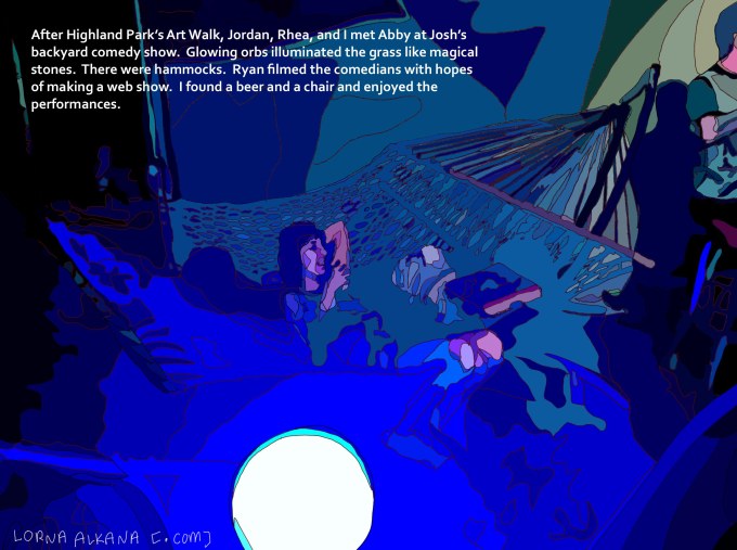 Image Text: After Highland Park’s Art Walk, Jordan, Rhea, and I met Abby at Josh’s backyard comedy show. Glowing orbs illuminated the grass like magical stones. There were hammocks. Bryan filmed the comedians with hopes of making a web show. I found a beer and a chair and enjoyed the performances.