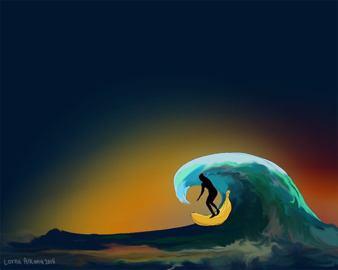 I drew this image for my dad’s funeral program. He loved to surf. The shapes are based off of an actual photo of him. Obviously the banana is an addition.