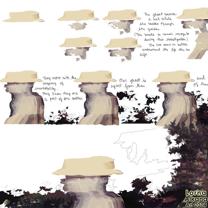 Here is the final 20″x30″ version of “Ghost Walking in Garden” that I showed at the Pancakes and Booze show in LA earlier this month. The text may be difficult to read here, but if you’re interested in the words, check out the art gif below.