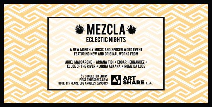 Join us in the heart of the Arts District, Thursday March 3rd, for our second installment of Mezcla: Eclectic Nights, a music and spoken word showcase featuring a diverse and intriguing line up of L.A. based musicians and poets.