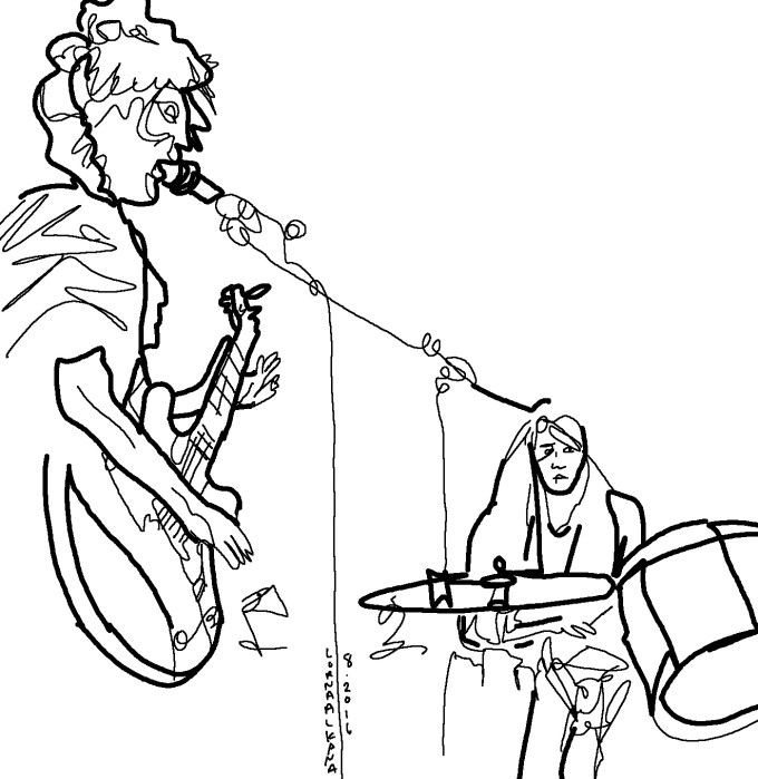 I ventured to the Shop Used // Shop Local event at a warehouse beneath the bridge on Glendale Blvd. I drank some free beer, talked to the vendors, and found a seat to continue my drawing before Wam Dingis took the stage. Oh I love Wam Dingis. I discovered The Walkmen, The White Stripes and Buzzcocks in high school, and these guys remind me of those sounds. I went to high school with two of the member of Wam Dingis so there is this generational or proximity wave-length element I might be vibing on. Or probably, they’re just GREAT! They had a stripped down set for this event and still killed it. They’re releasing their EP on September 10th at Non Plus Ultra! [VIDEO] Here’s a bit of them IN THE LIGHT OF DAY at Shop Used // Shop Local . I long for Mindy (Rhodes/vocals/violin) and Angela (bass/vocals) but the set abides! Oh man, I love this band.