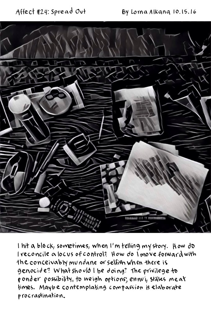 I hit a block, sometimes, when I’m telling my story. How do I reconcile a locus of control? How do I move forward with the conceivably mundane or selfish when there is genocide? What should I be doing? The privilege to ponder possibility, to weigh options; ennui, stifles me at times. Maybe contemplating compassion is elaborate procrastination.