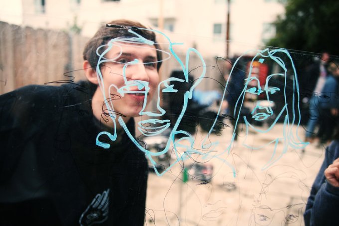Beating Lights shows always have great music and good vibes. They also have art! I joined Beating Lights for their 2017 Kick-off in an East Hollywood backyard. I drew portraits of people on a piece of plastic they held up to their faces. This was my first time making portraits in this way. I’ve played with transparency before with plastic, but the idea clicked in a brainstorm session trying to figure out an interactive art plan for the show.
