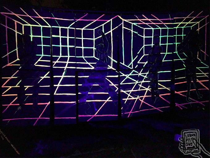 I turned different panels into chalkboards and then painted grids with white lines (I should have used rulers…) so that when I layered fluorescent paint over them it’d keep the glow vibrant.