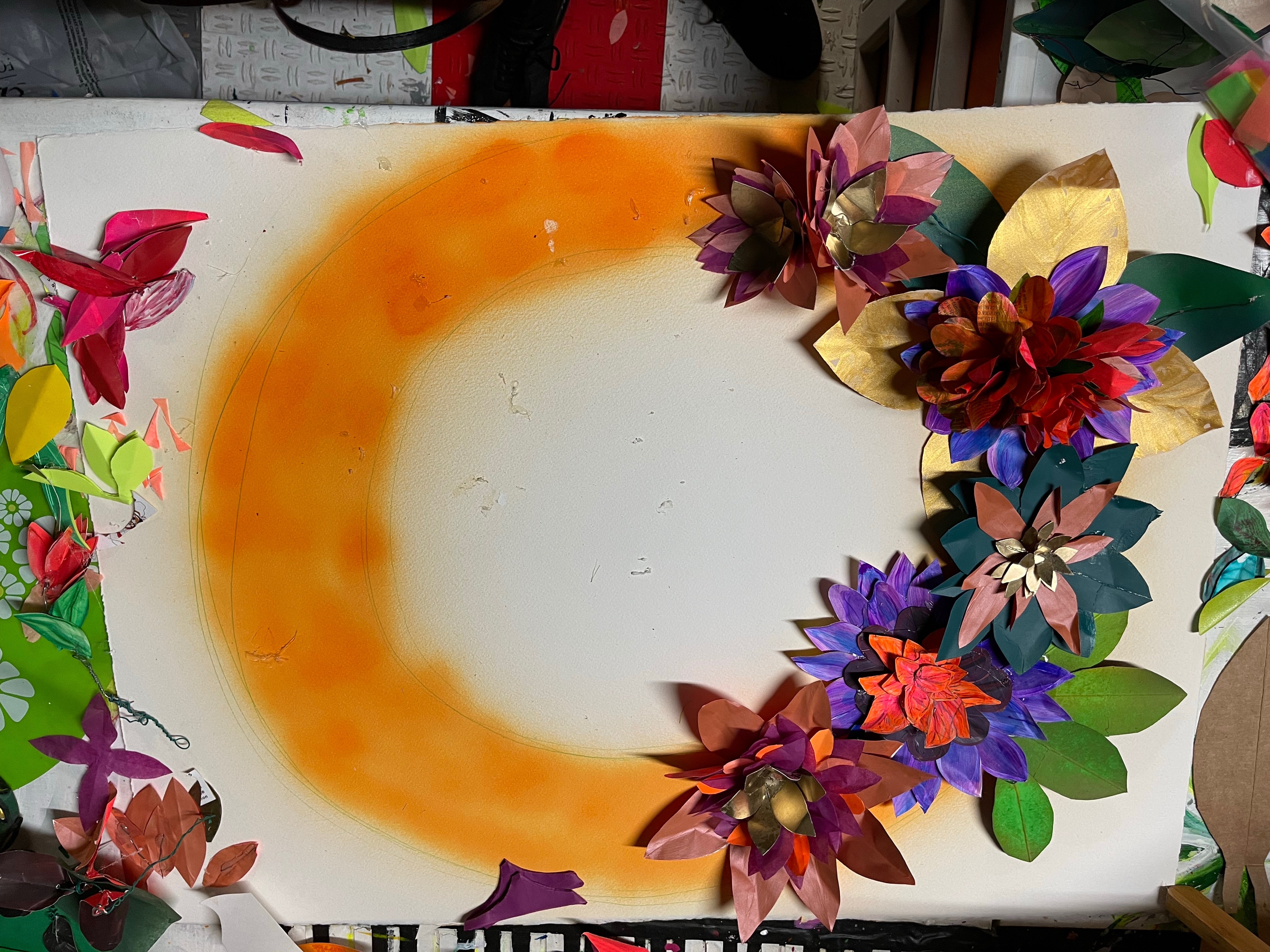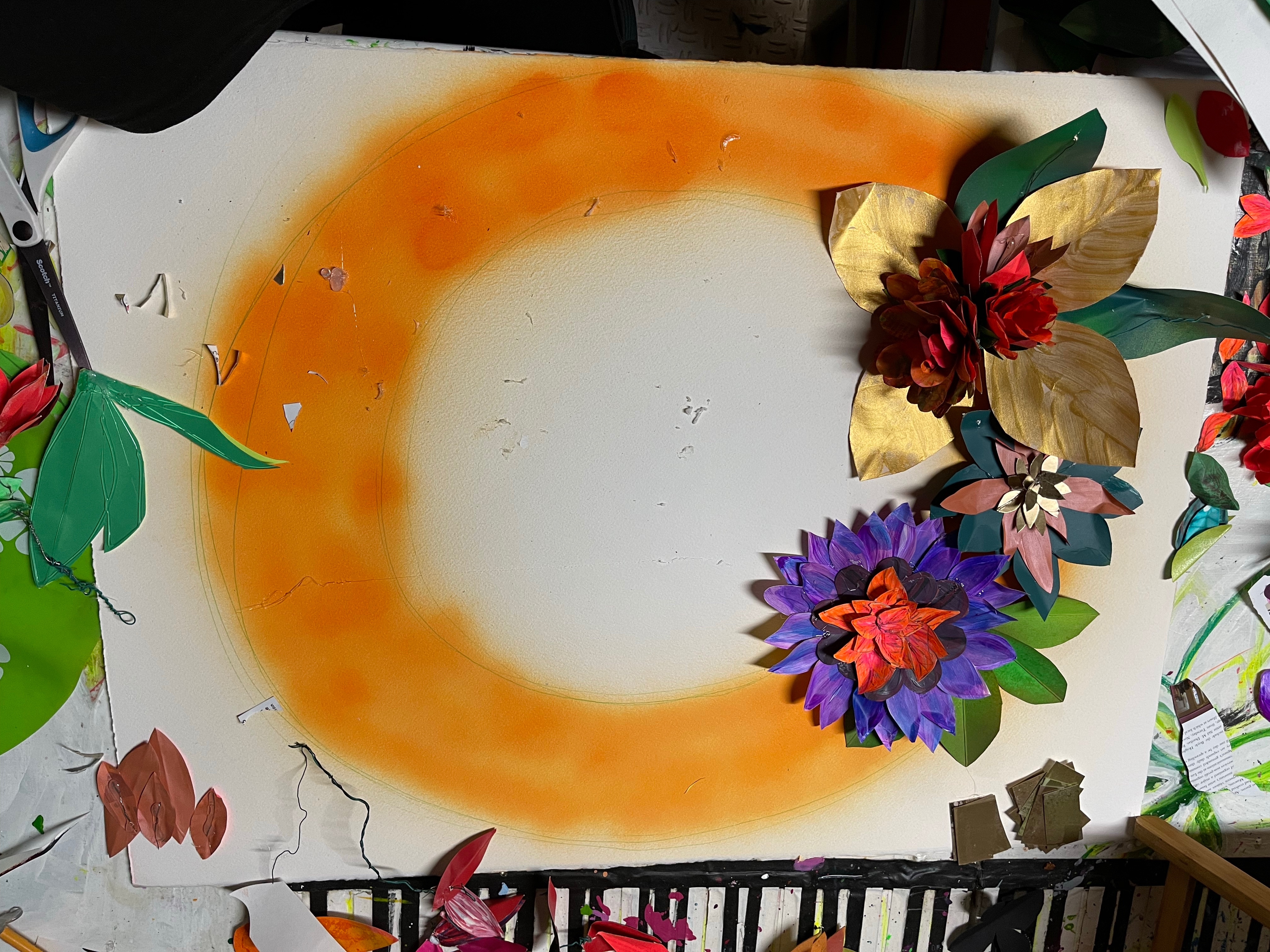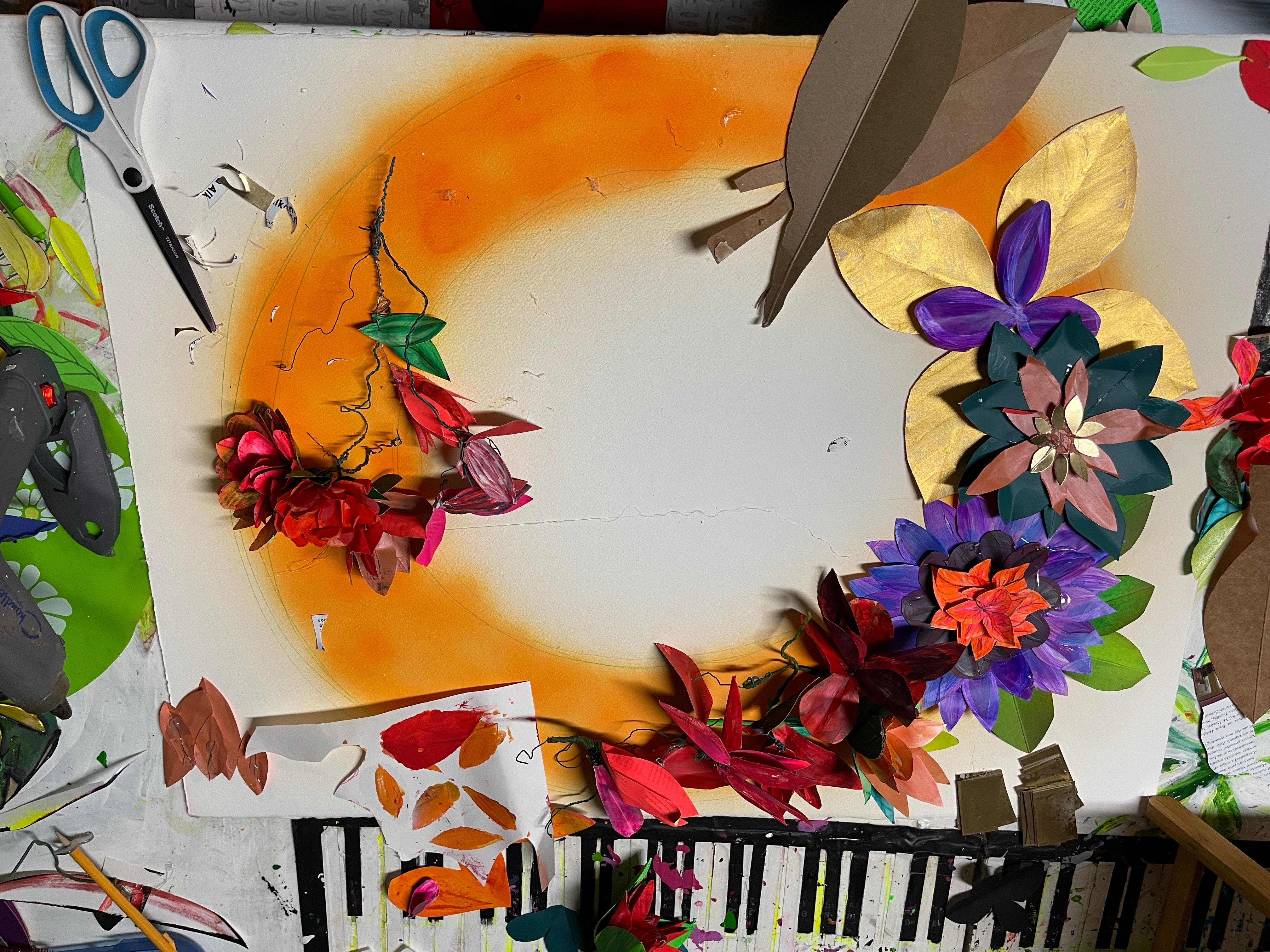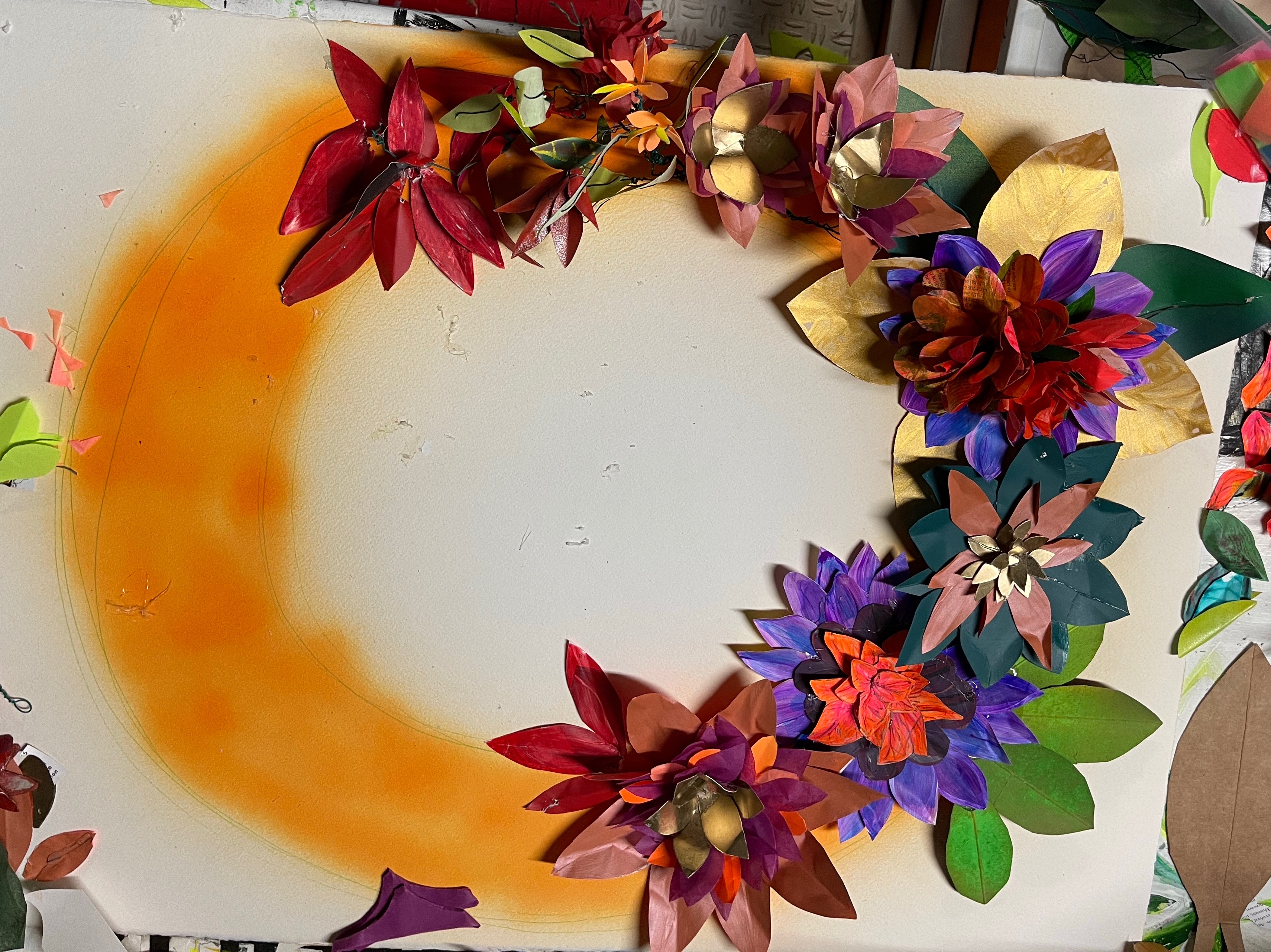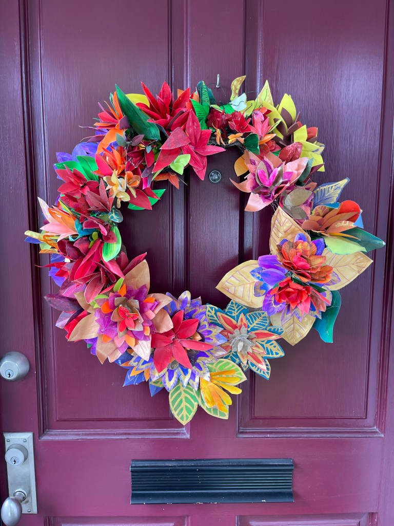 I created a wreath for November to welcome the friends and family we will see (safely) this month. I used this as an opportunity to consolidate, organize, and repurpose pieces of paper flowers I’ve made this past year. I have tubs of Frankenstein flowers and construction experiments.