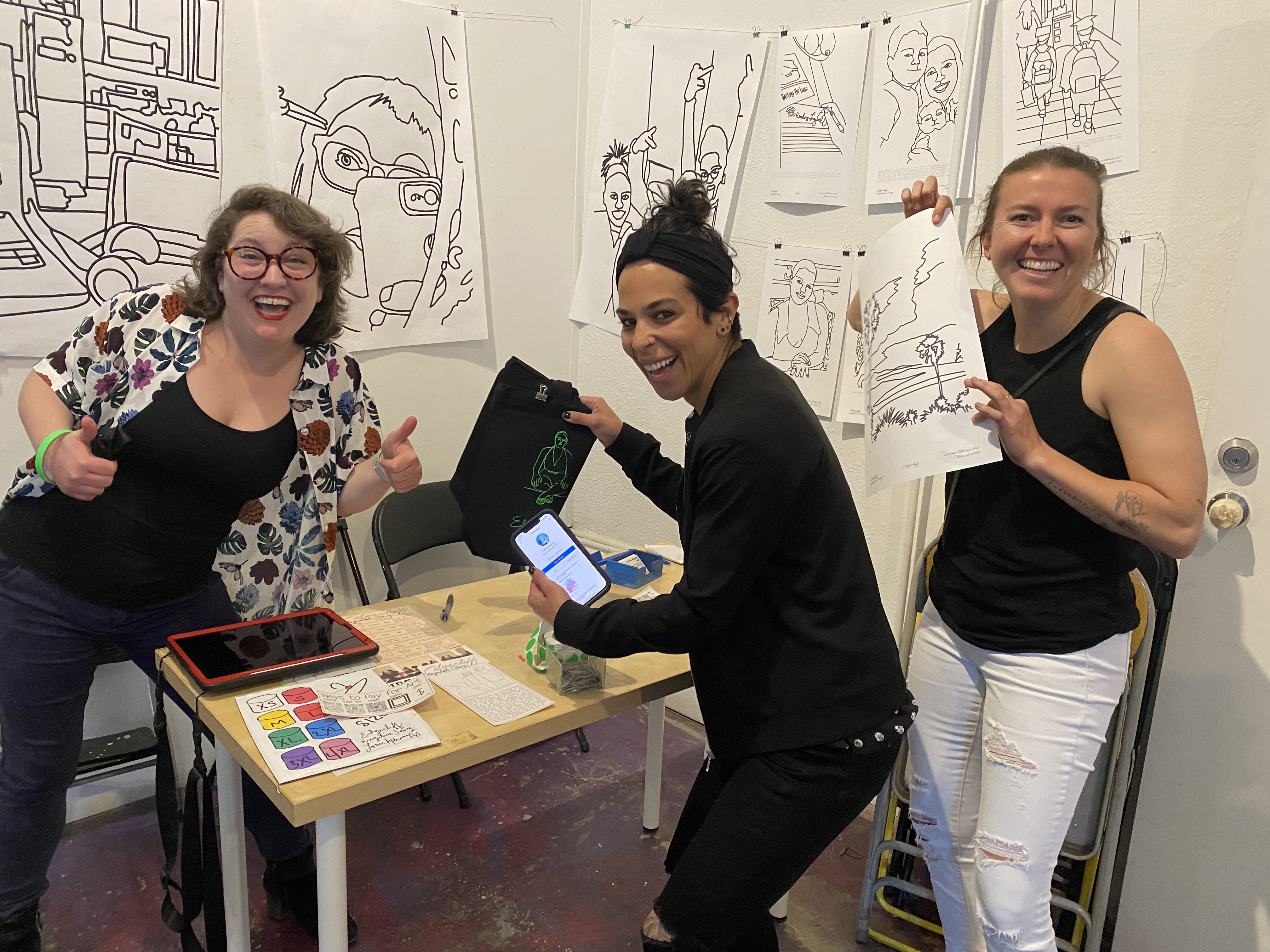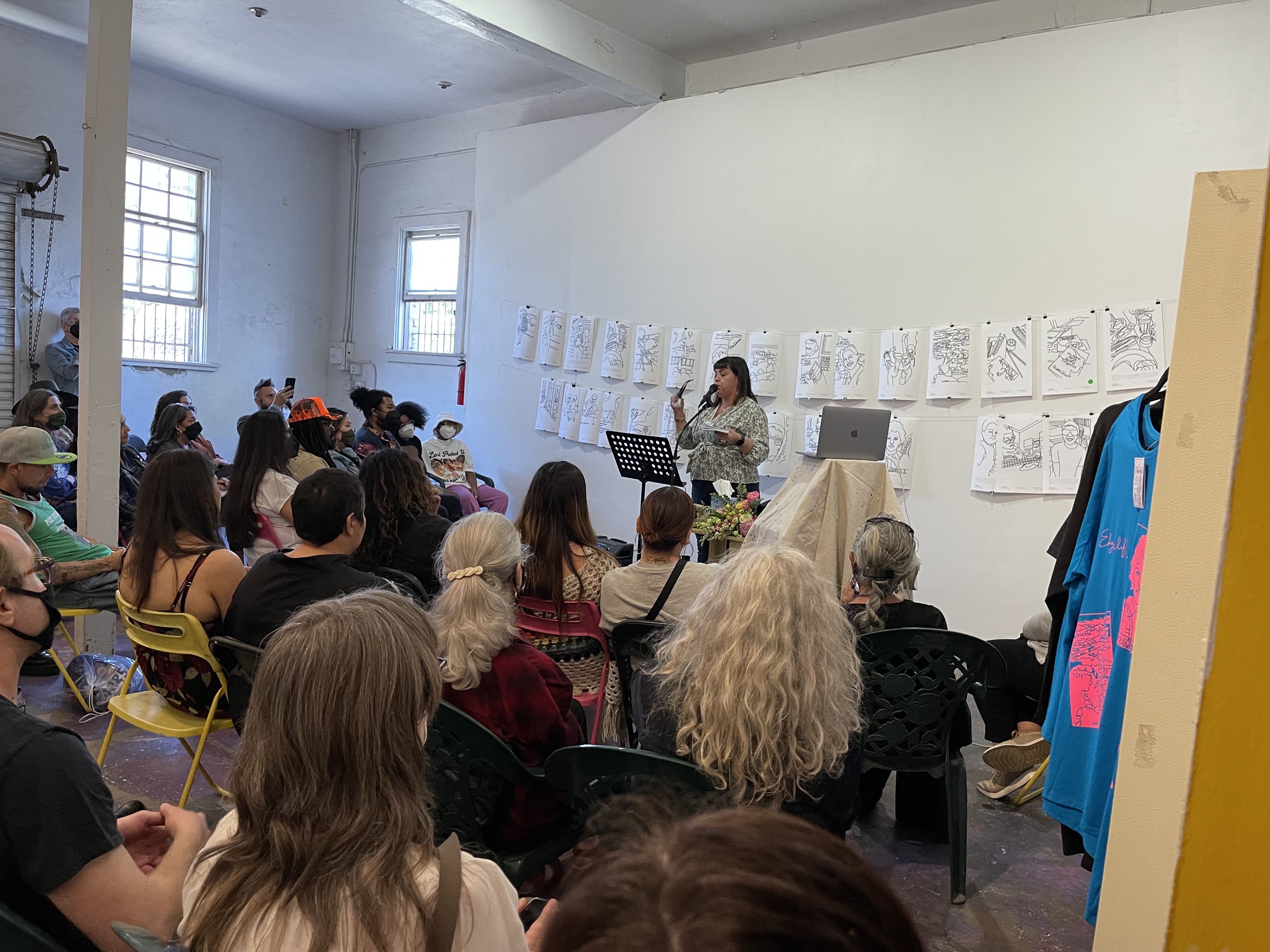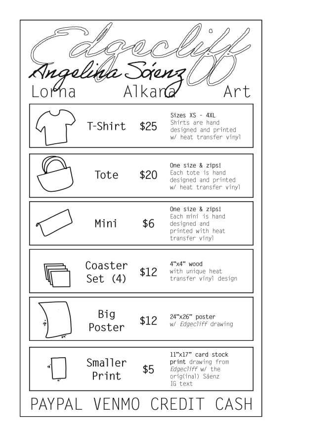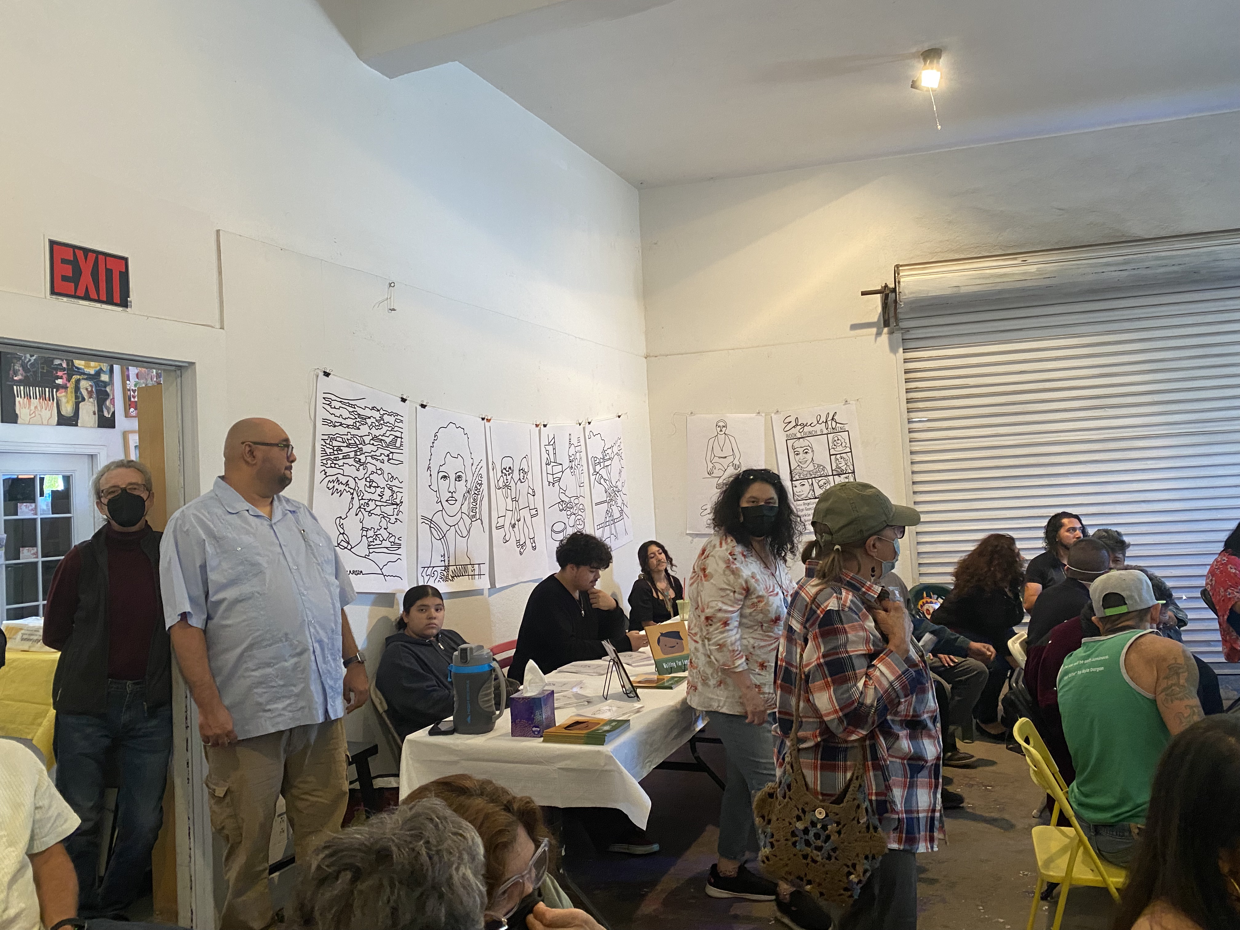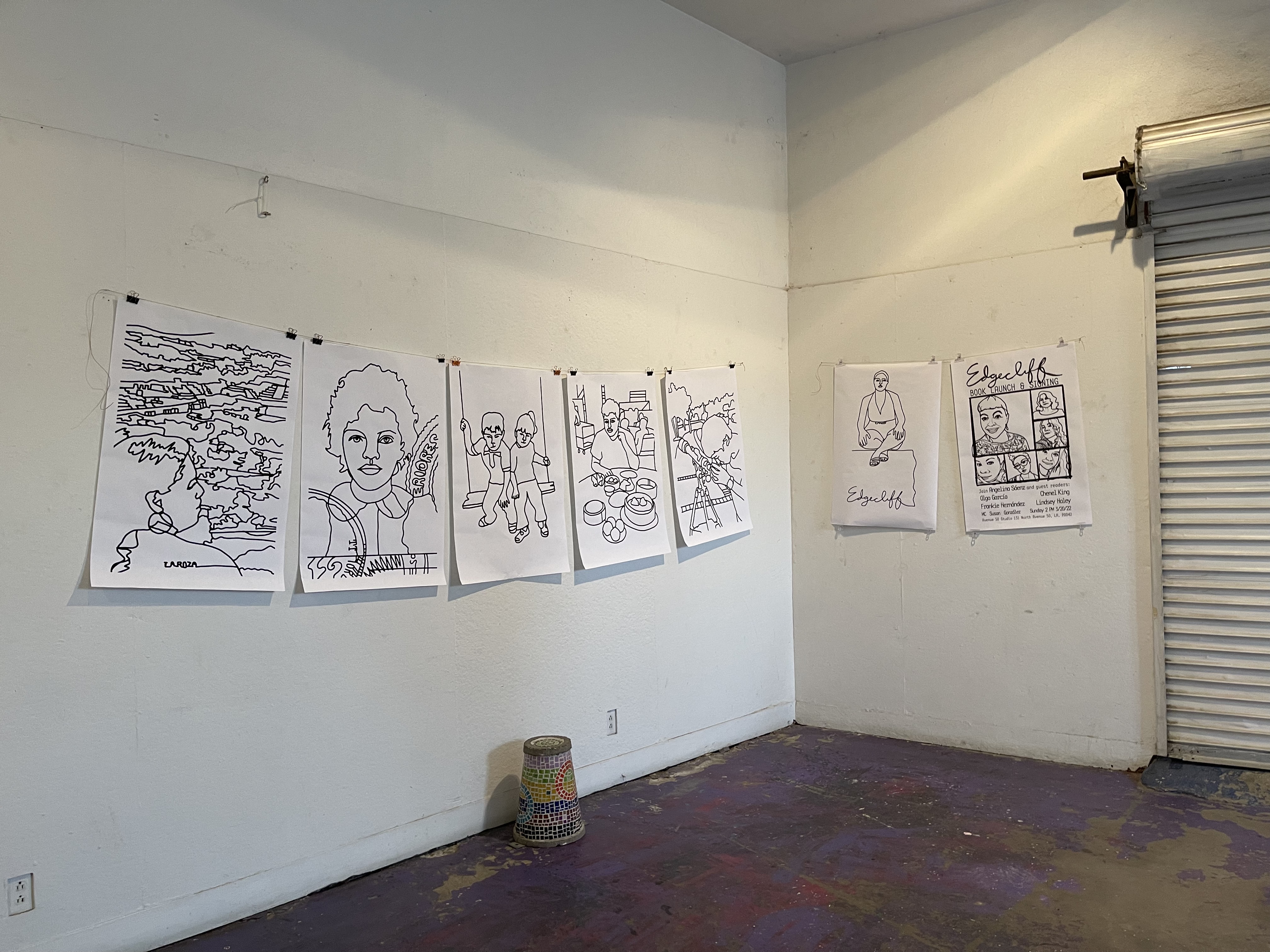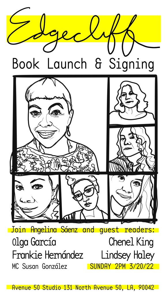 Flashback to mid-March. I was getting poetry merch ready for the launch of Angelina Sáenz‘s book of poems Edgecliff at Avenue 50 Studio in Los Angeles. Angelina messaged me about how the LA Times wanted to feature Avenue 50 Studio in an upcoming article, and they wanted to take photos of Angelina’s launch to use in the story. They wondered if I could fill the room with my illustrations in Angelina’s book. Yes. Yes, I could.