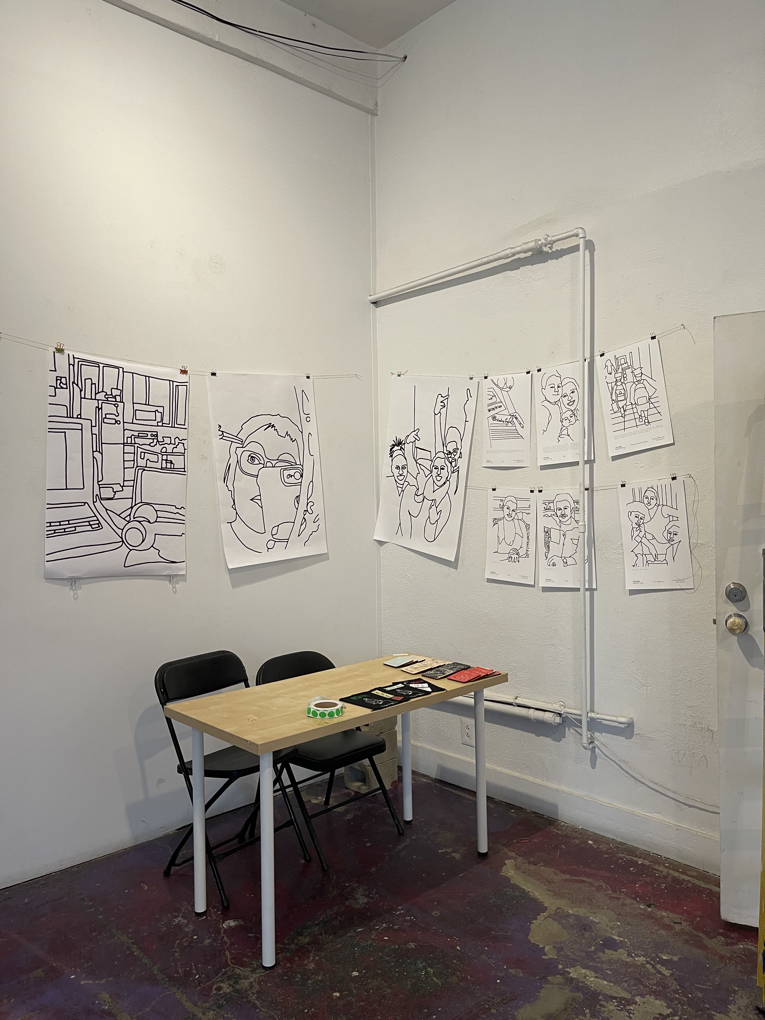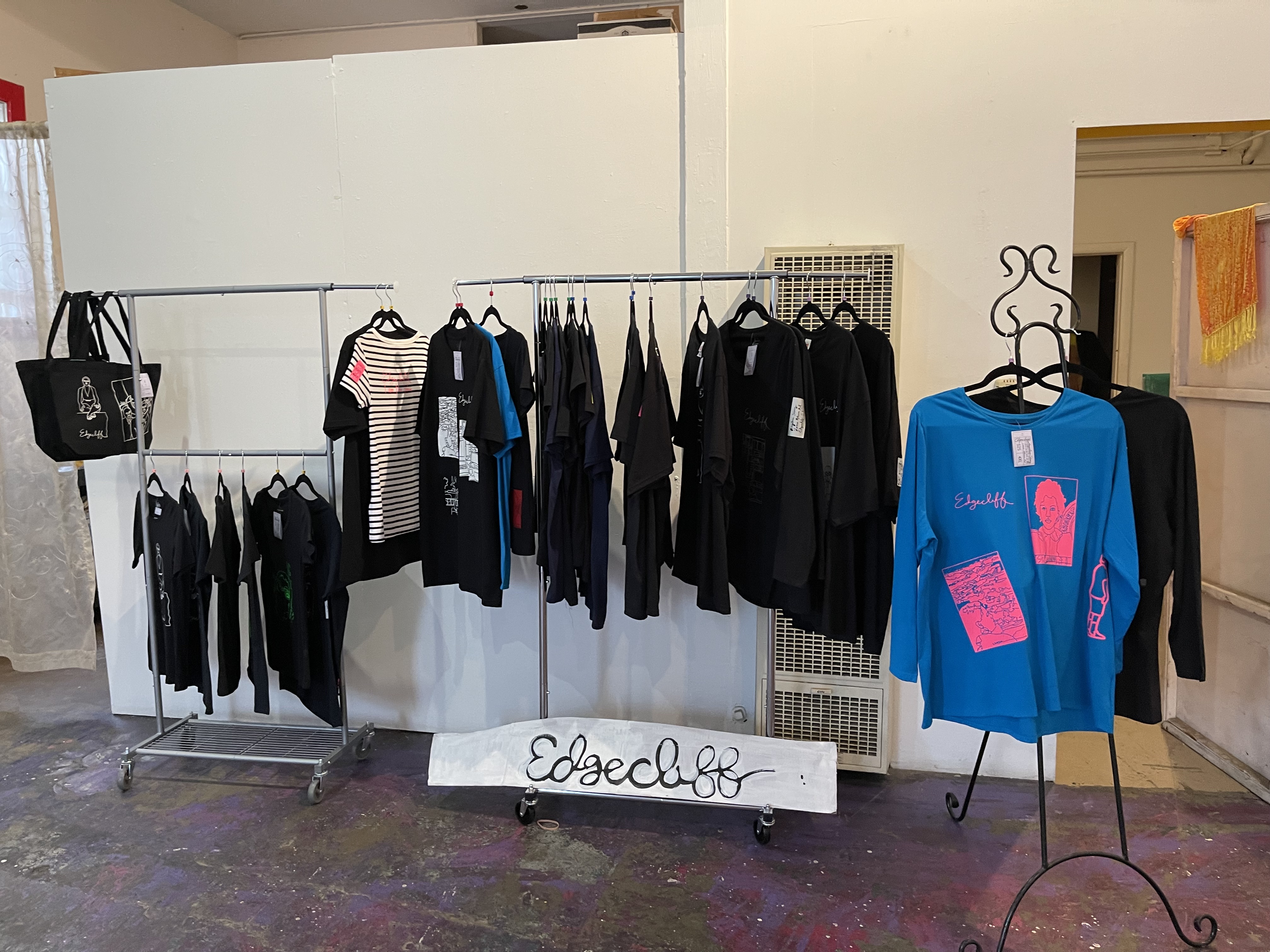 I used hemp rope and a lot of little clips. I set up my merch table and t-shirt rack.