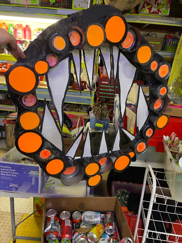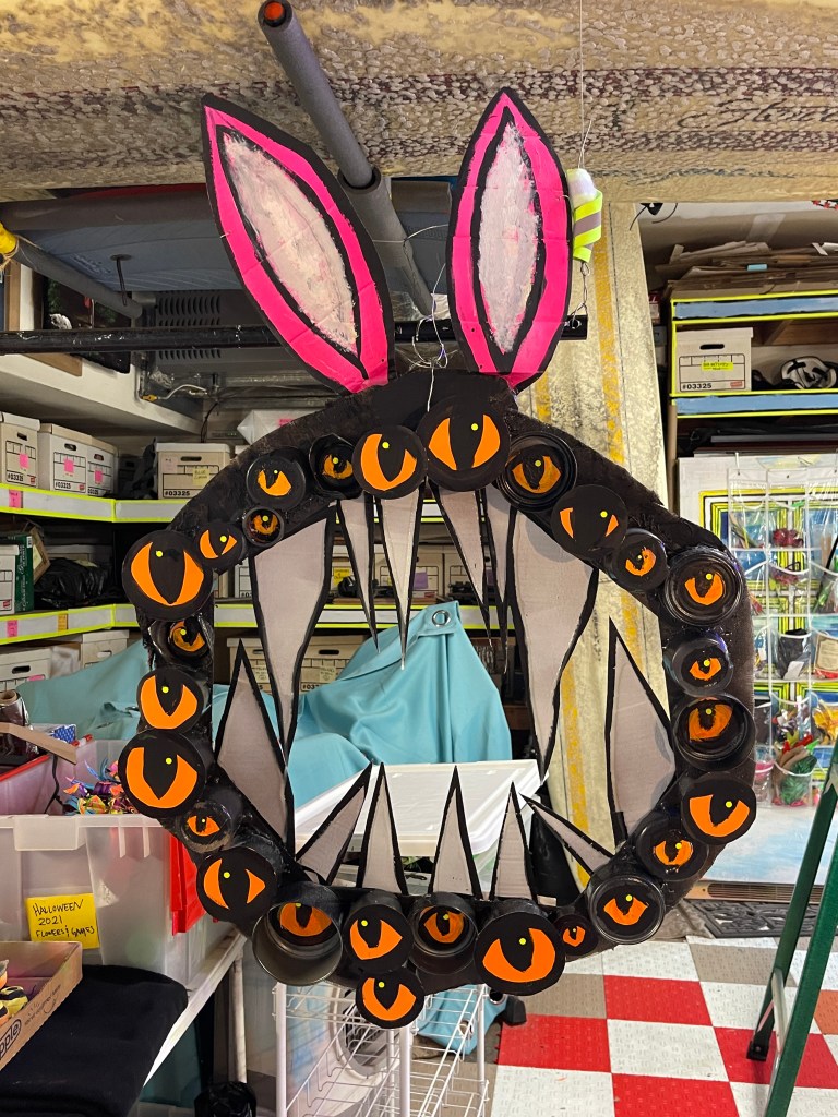I glued some firm cardboard pieces together into a circle that took up most of the width of the door frame. I secured the cardboard with mesh and binder clips. I placed and then glued a bunch of materials from my “circles bin” which I assume everyone has: collected spray paint lids, empty tape rolls, bottle caps, empty tuna cans, etc.. I attached some circles, made eyeballs, added cardboard teeth and bunny ears.