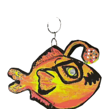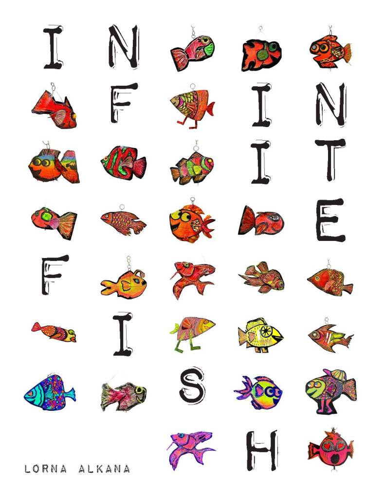 Infinite Fish, from artist Lorna Alkana, is an expanding array of cardboard fish friends who are bright and bizarre. Alkana uses a hole punch and binder rings to vertically connect these double-faced, inconsistently finned fish into limitless columns. The fish twist in floating arrangements, allowing light to catch their mirror eyes and metallic, illogically placed scales. Their grins.